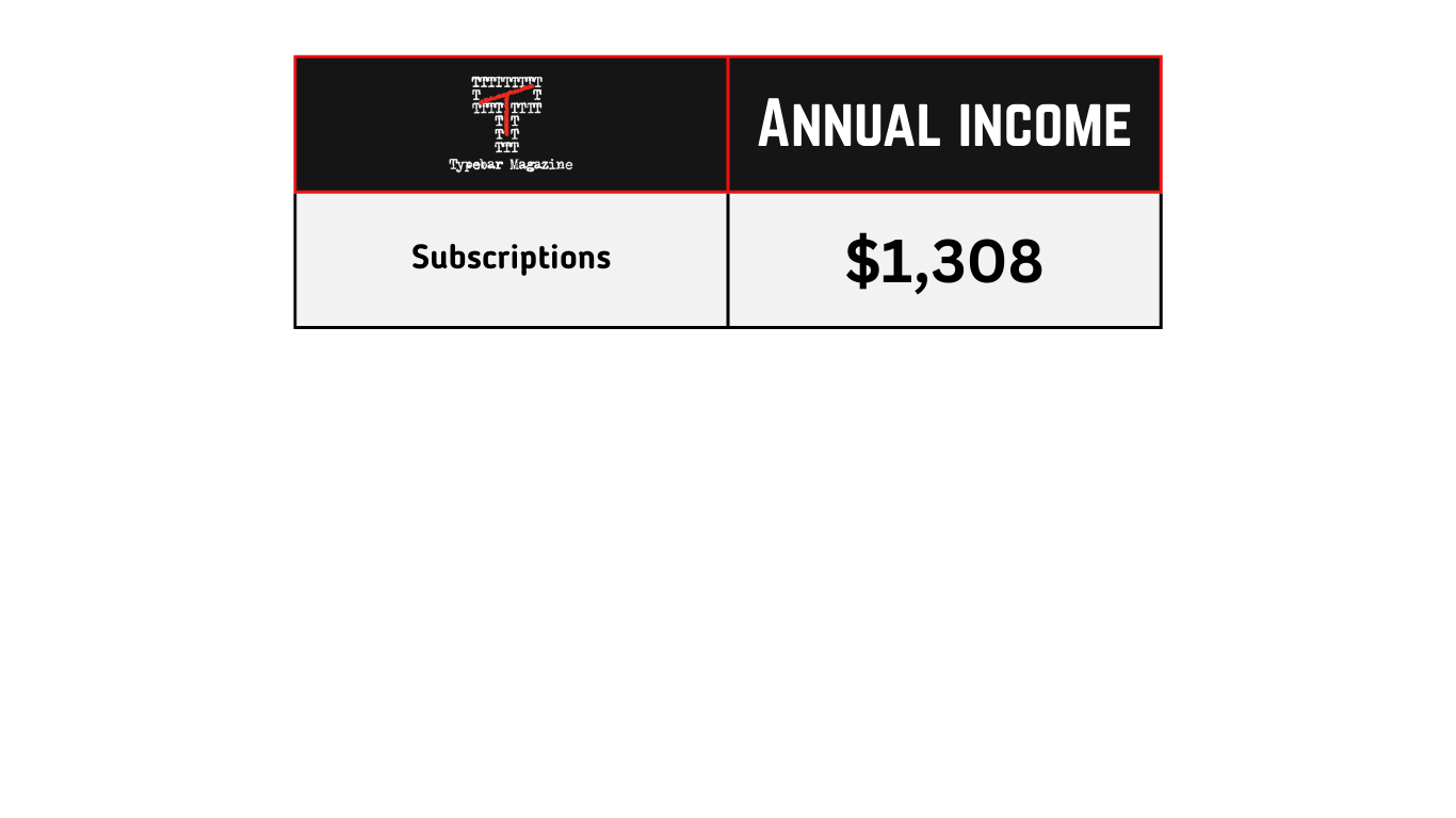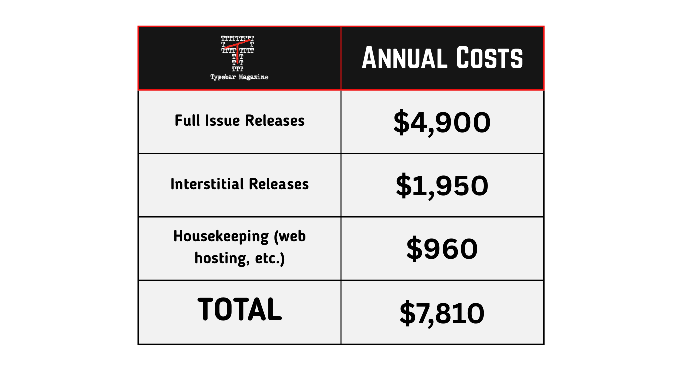 Thus, when you take our income versus our expenses, Typebar Magazine is currently losing $6,502 per year. I am lucky enough to have part-time work supplementing my full-time income. I put the money from my part-time job into the magazine out of love for literary criticism and out of a desire to see the artform not just survive but iterate, evolve, and claw back the cultural perch that was taken from it.
